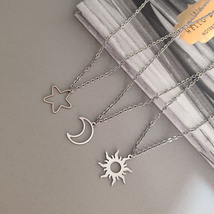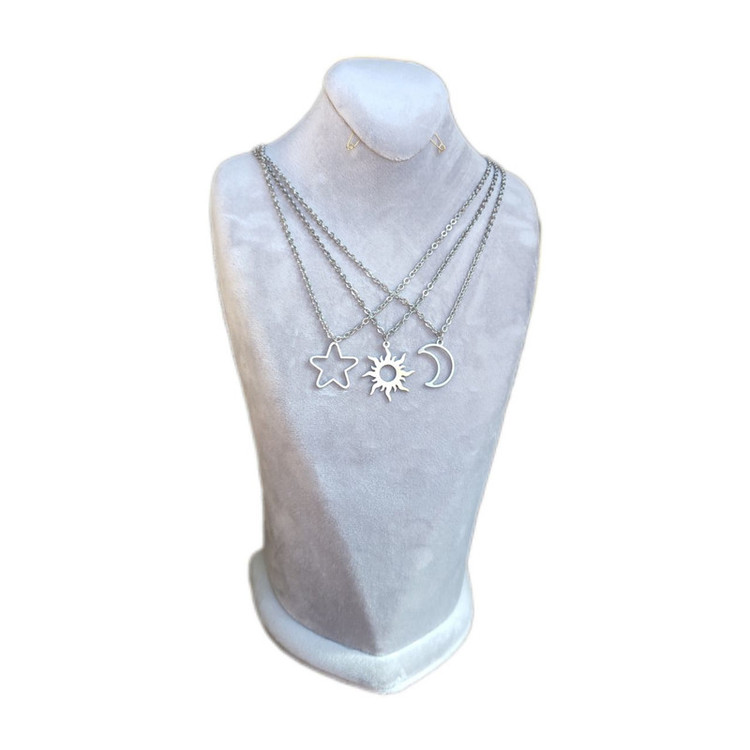 این بسته شامل سه گردنبند ماه و خورشید و ستاره است که به صورت جداگانه قابل استفاده هستند. برای ست دوستی سه نفره مناسب است. جنس پلاک و زنجیر استیل رنگ ثابت و مناسب استفاده روزانه است. طول زنجیر 45+5سانتی متر زنجیر سایز است.