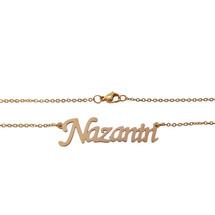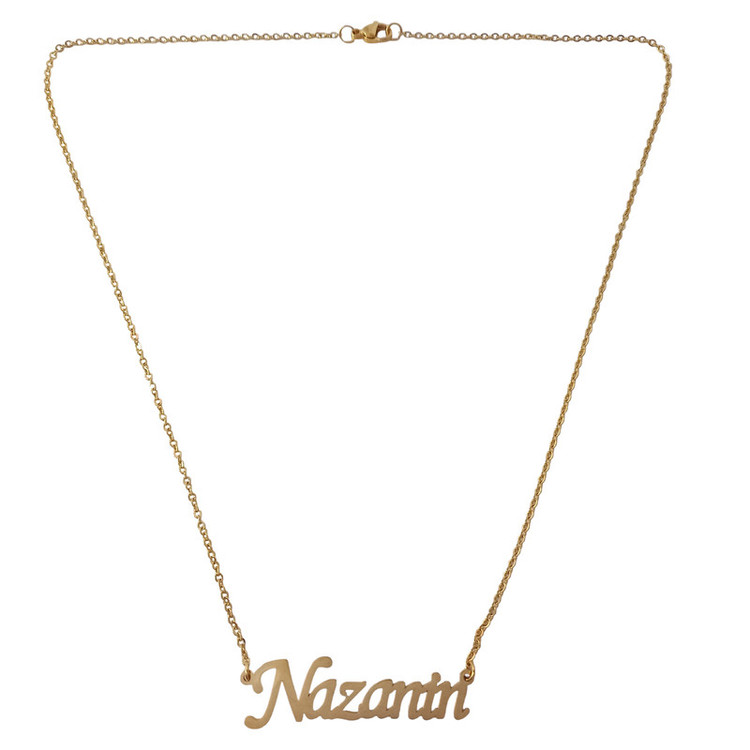 گردنبند اسم نازنین از جنس استیل طلایی رنگ ثابت و ضد حساسیت و با فونت زیبای انگلیسی می تواند بهترین هدیه برای کسانی باشد که نام آنها نازنین است.جنس استیل این گردنبندها باعث می شود که این گردنبندها در هیچ شرایطی باعث بروز حساسیت در پوست شما نگردد و با خیال راحت می توانید از آن استفاده نمایید. طول زنجیر هر طرف پلاک بیست و دو سانتیمتر و در کل با قفل آن چهل و پنج سانتیمتر می باشد.